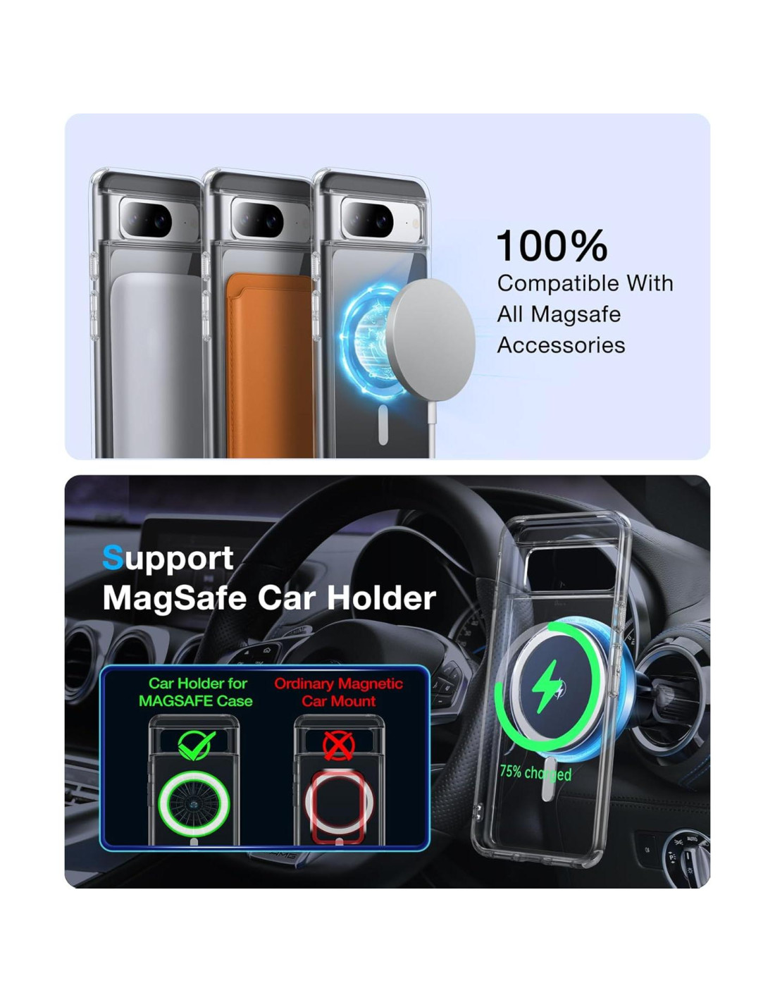 - Compatible con Accesorios MagSafe. Los imanes N52 incorporados ofrecen una experiencia de sujeción fuerte y una carga inalámbrica más rápida. Puedes cargar tu funda de Google Pixel 8 en MagSafe o cargador Qi para una increíble comodidad sin quitar la funda. Recordatorio: Todas las fundas de teléfono MagSafe deben usarse con el soporte magnético de automóvil dedicado MAGSAFE y no son compatibles con soportes magnéticos de automóvil regulares (debido al pequeño área de adhesión magnética, no pueden alinearse con el anillo magnético MagSafe).