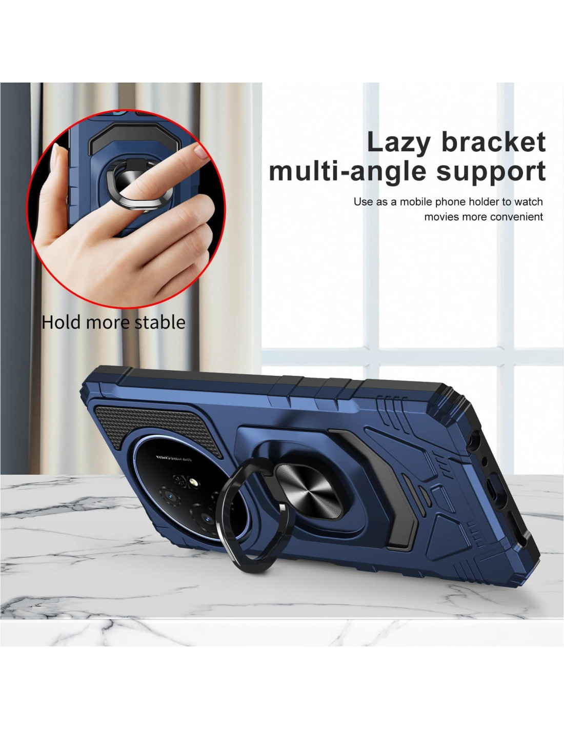 - Soporte de Metal Incorporado: Proporciona múltiples ángulos ajustables para ver videos, liberando tus manos. También puedes pasar tu dedo a través del anillo para evitar que se caiga. La hoja de metal incorporada se puede adjuntar de manera estable al soporte magnético para automóvil.