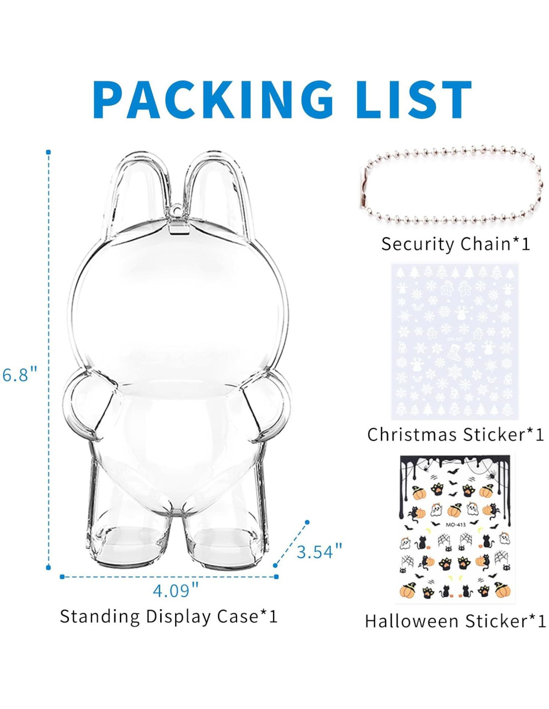 Diseñada especialmente para la Serie de Pie (Macarón Emocionante o Gran Energía), fija tu muñeca para evitar movimientos y desgaste, asegurando que el juguete de peluche siempre mantenga su mejor estado. (Nota: Gran Energía tiene cabello realmente grueso, por lo que al instalarlo en una funda protectora, el exceso de cabello debe ser presionado dentro de la funda) La caja de exhibición transparente Bestoct proporciona protección mientras es fácil de manejar, la funda protectora es el compañero perfecto para los amantes de las muñecas de Los Monstruos. La caja de exhibición transparente envuelve el juguete para evitar que el polvo entre en el peluche, manteniendo tu muñeca limpia. Esto es muy beneficioso para los juguetes de peluche que son difíciles de limpiar. Además, la carcasa dura es una barrera física que puede prevenir eficazmente que la muñeca se raye. Especialmente en lugares públicos con gran afluencia de personas. El paquete incluye una etiqueta de Navidad y una etiqueta de Halloween, para que puedas personalizar tu caja de exhibición. IMPORTANTE Cómo usar: 1. Elige tu patrón favorito 2. Usa pinzas para despegar suavemente el patrón seleccionado (no toques la parte adhesiva) 3. Pégalo en la caja transparente Cómo quitar: 1. Calienta la etiqueta con un calentador 2. Despega la etiqueta 3. Lava con jabón de manos neutro y seca.