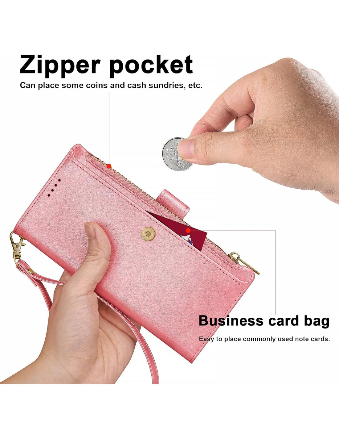 - <b>[ Con pulsera portátil y función de soporte ]</b>:<br>Incluye una pulsera portátil de cuero PU conectada a la funda protectora de la billetera. La función de soporte es conveniente para ver películas o chatear por video. El fuerte botón magnético mantiene la funda de cuero cerrada todo el tiempo y protege tu teléfono de manera más efectiva. La carcasa interna de TPU tiene botones de corte preciso para un fácil toque y respuesta rápida. La suave carcasa interna de TPU protege el teléfono de bordes absorbentes de impactos y a prueba de golpes. <br>