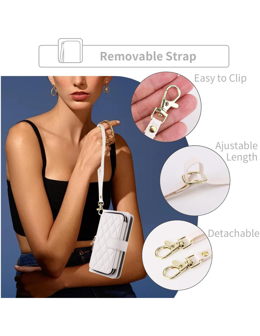 - [Correa Desmontable y Cremallera Exquisita] : Correa de Muñeca y Correa de Hombro Cruzada mantienen tu Teléfono cerca sin perderlo y la Cremallera Exquisita mantendrá todas tus pertenencias a salvo en su lugar.
