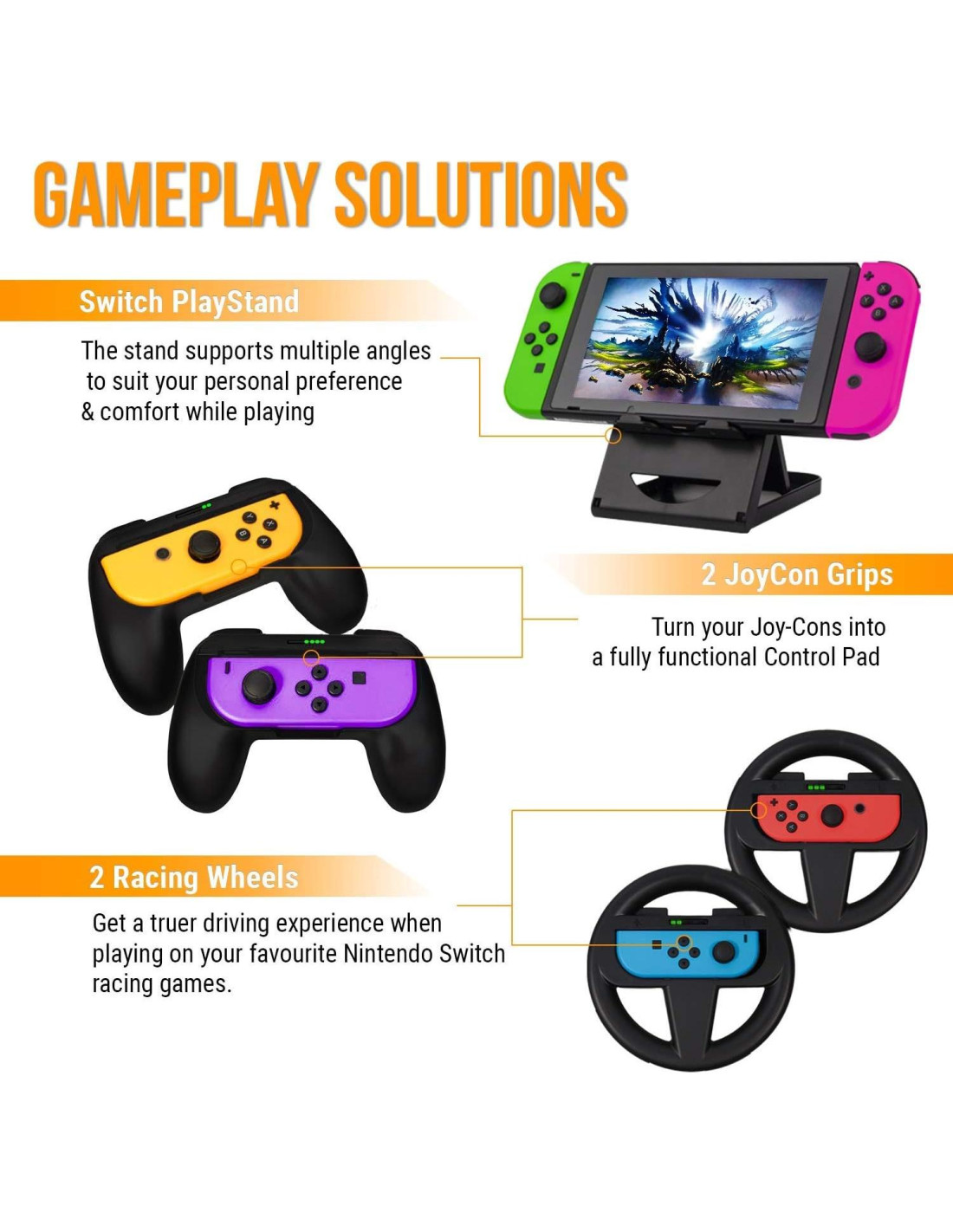 - ACCESORIOS PREMIUM PARA SWITCH: Fantásticos accesorios como los volantes para Switch y las Agarraderas Joy-con ayudarán a mejorar tu experiencia de juego y darán vida a juegos como Mario Kart o Smash Bros. Nuestro Cargador Joycon se asegurará de que siempre tengas controladores de repuesto listos para jugar.