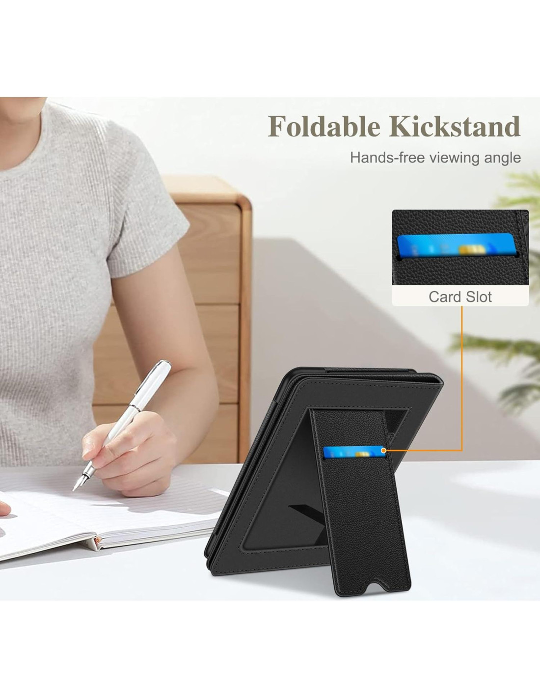 - Soporte Plegable: El diseño del soporte permite liberar tus manos mientras lees. El bolsillo para tarjetas incorporado es conveniente para guardar tus tarjetas y efectivo.