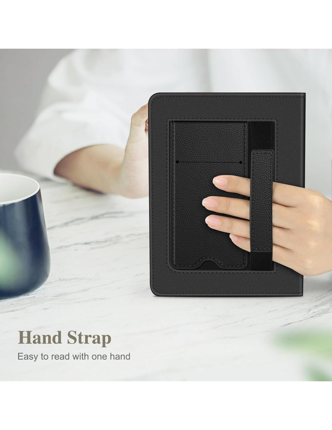 - Bolsillo para Tarjetas Incorporado y Correa de Mano: El bolsillo para documentos está diseñado para que guardes tus tarjetas de presentación, tarjetas bancarias, efectivo, notas o facturas mientras estás en movimiento. La correa de mano permite leer con una mano de manera más fácil y cómoda.