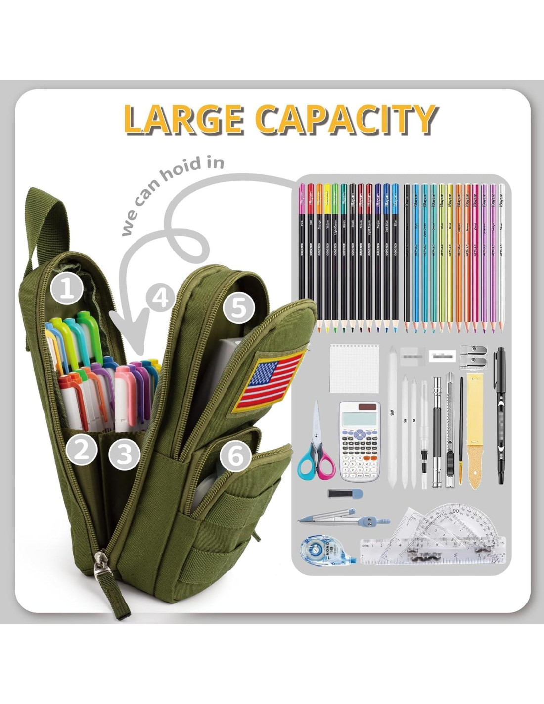 - DISEÑO ÚNICO - El estuche de lápices tiene un diseño único en la parte frontal donde se pueden colocar diferentes parches que te gusten. Bolsillo frontal resistente para un uso fácil. Un asa extra en la parte superior hace que la bolsa de lápices sea fácil de llevar. Dos cremalleras para abrir y cerrar. El cinturón MOLLE frontal también permite que se adjunte a tu mochila más grande, o fijar algunas herramientas pequeñas en él. ESTE ARTÍCULO NO ESTÁ DESTINADO PARA USO POR NIÑOS DE 12 AÑOS O MENOS.