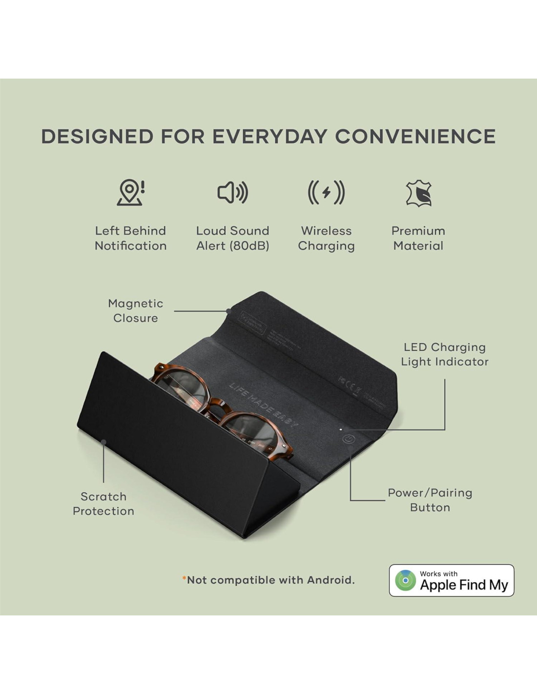 - Construido para Durar - Fabricado con materiales premium con un forro de microsuede suave, proporciona una protección superior contra rasguños y marcas. El cierre magnético no solo mejora la sensación de alta gama, sino que también mantiene tus gafas seguras dondequiera que vayas. La durabilidad está en el núcleo de su diseño, con rigurosas pruebas de materiales para humedad, fricción y temperatura, así como ciclos de apertura/cierre y pruebas de rendimiento para todas las funciones de Find My. Ya sea que estés viajando o haciendo diligencias.