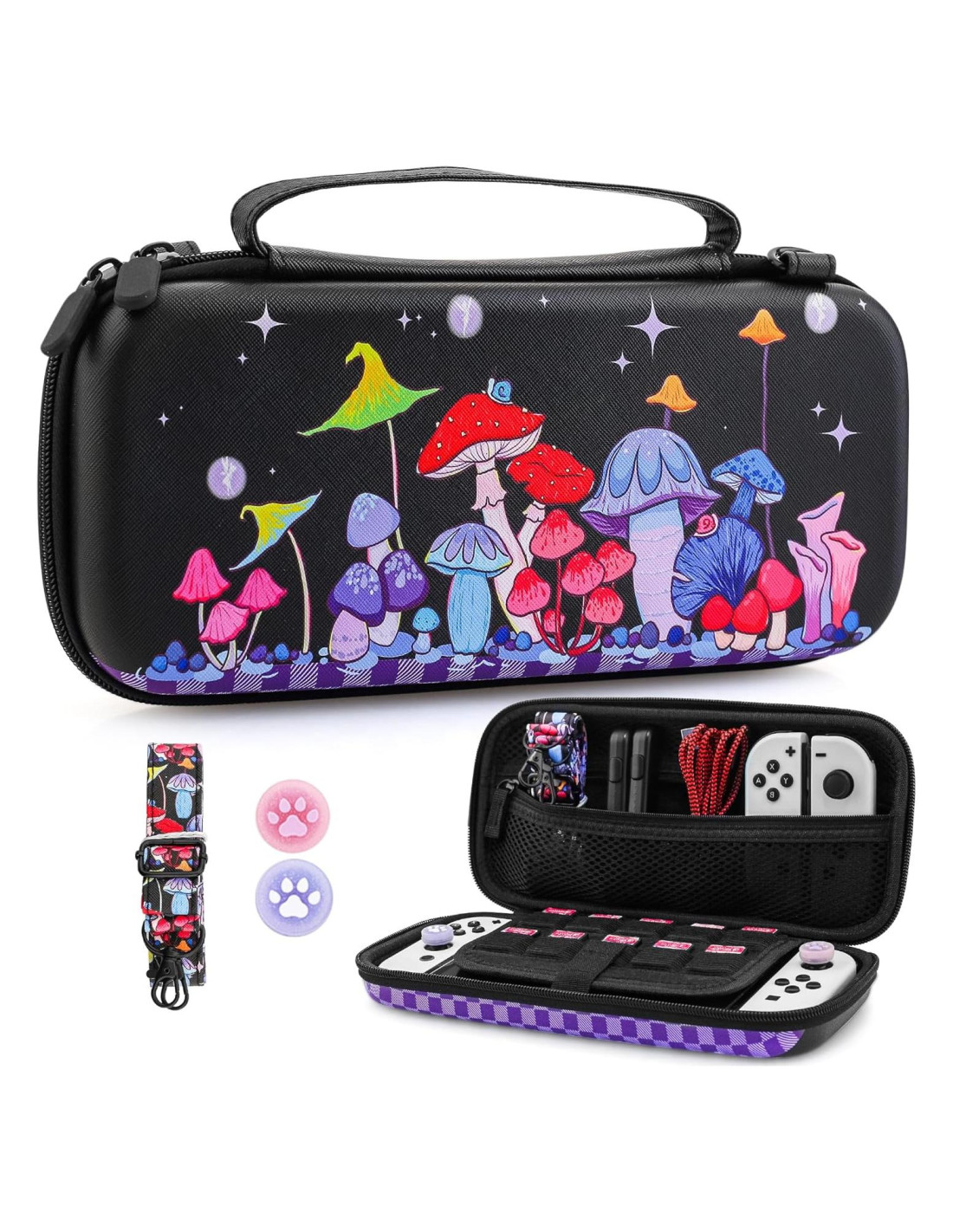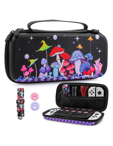 - [Diseño de Tema de Champiñón] Funda negra para switch diseñada especialmente para nintendo switch/oled, patrón de champiñón y combinación de color negro, llena de vitalidad. La funda de viaje para switch está equipada con la misma correa de hombro de color, tapa de pulgar suave de gato con purpurina rosa y morada para proteger el joystick de la fricción.
