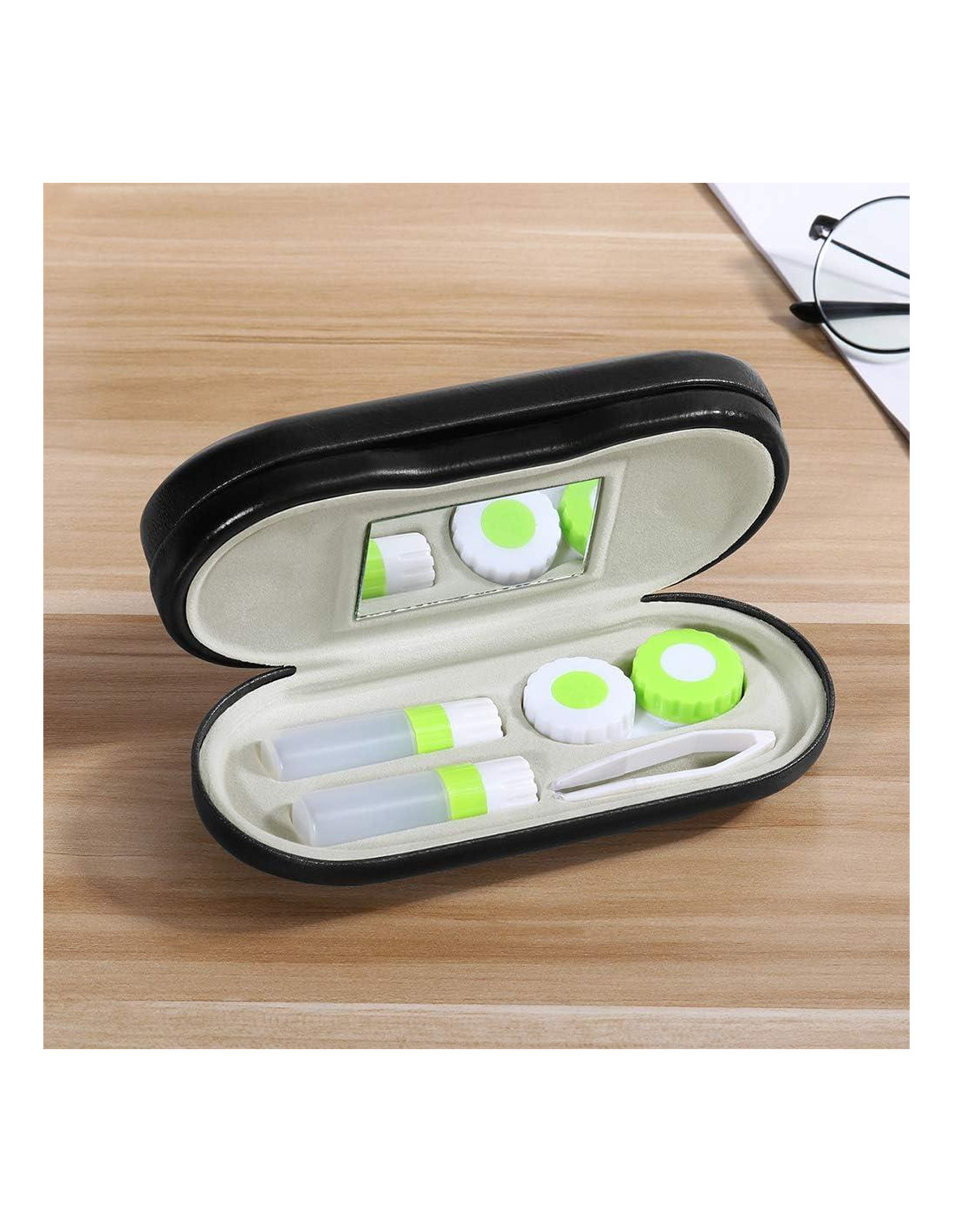 - Diseño de doble lado: Las gafas se almacenan en un lado del estuche y los accesorios de lentes de contacto se guardan en el otro lado.