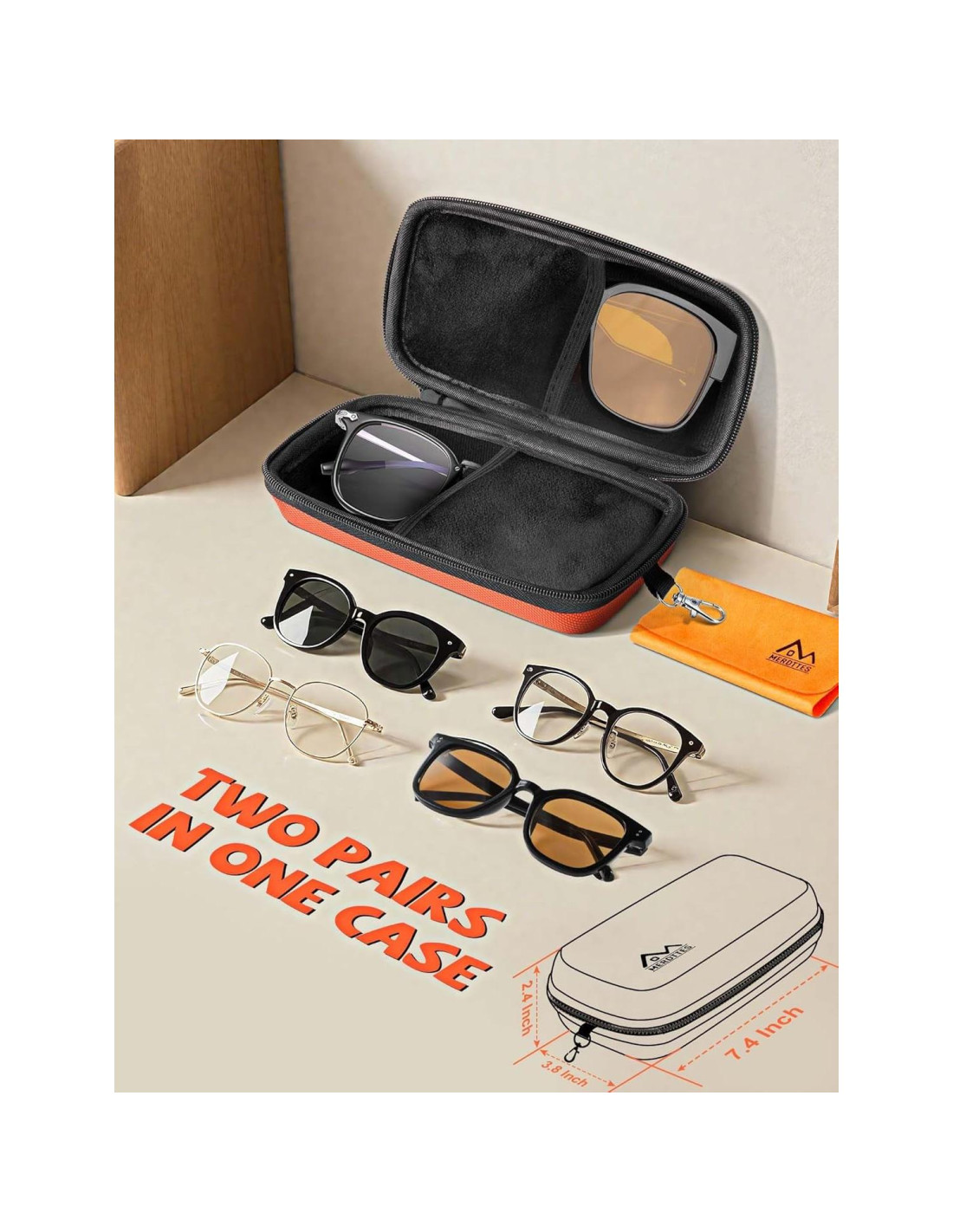 - [Estuche Doble para Gafas] : El estuche de gafas de doble cara MERDTTES presenta espacio de almacenamiento interno de 6.7*3.2*2 pulgadas (externo 7.1*3.7*2.4 pulgadas) que es casi adecuado para todos los tamaños de gafas. Puedes almacenar gafas de lectura, gafas recetadas y gafas de sol con facilidad. No más buscar múltiples estuches de gafas.