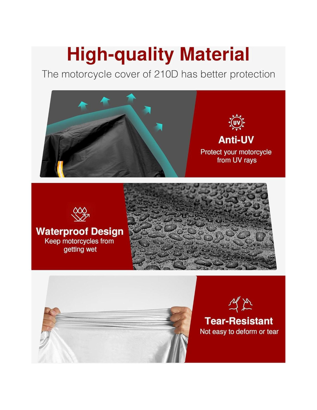 - Protección climática premium: Nuestra funda para motocicleta está hecha de tela de alta calidad 210D, que tiene un rendimiento impermeable excepcional. Esta funda proporciona protección contra la lluvia, la nieve, el polvo y los excrementos de aves, asegurando que tu motocicleta permanezca en excelente estado sin importar el clima.