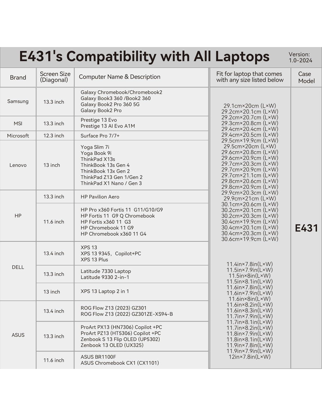 - Modelo No.: E431; dimensiones internas de la funda: 32x21.6x2 cm (12.6x8.5x0.79 pulgadas)