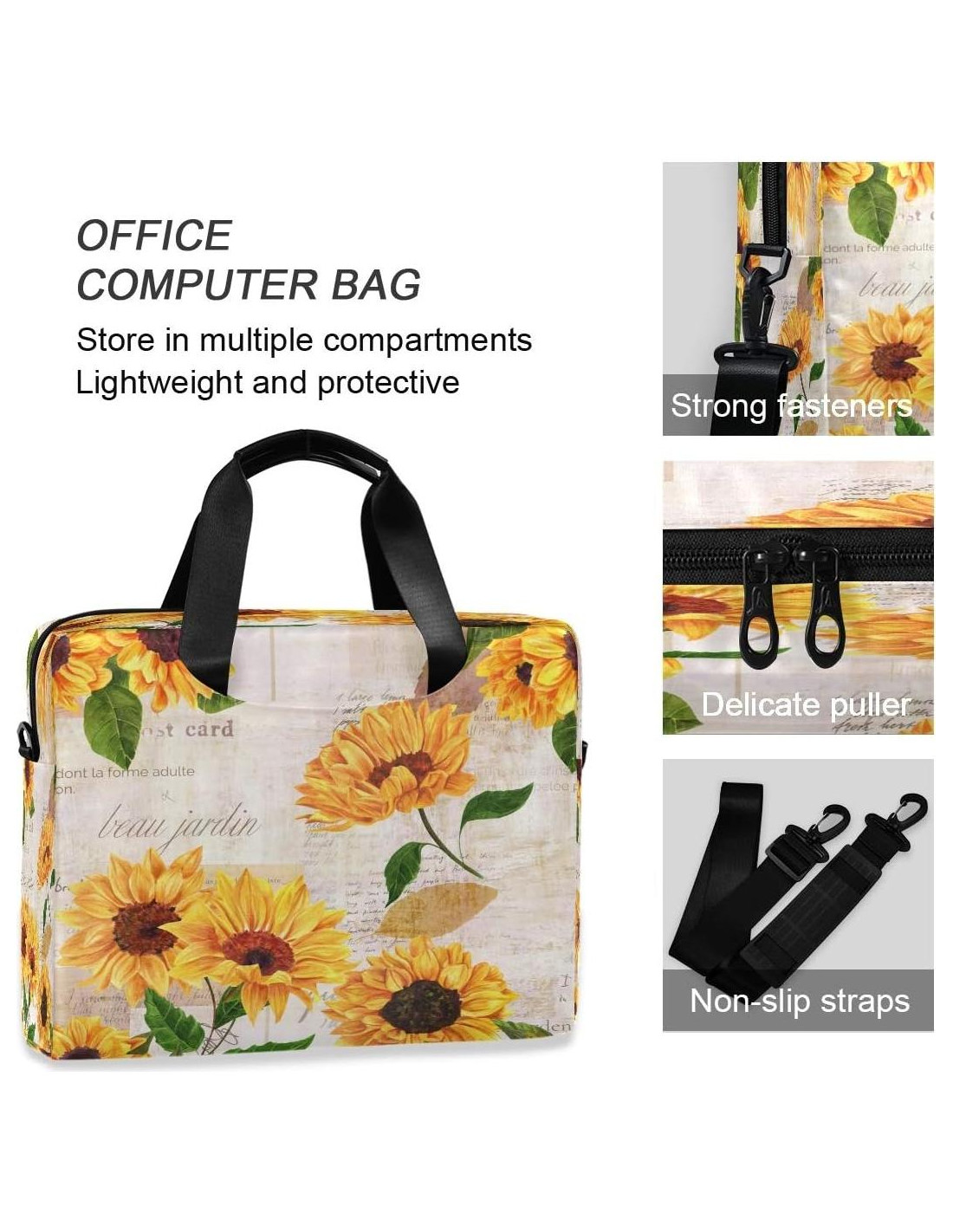 Detalles del Producto Material: Tela de poliéster de alta calidad, duradera Tamaño: 15.7x3x11.8 pulgadas (40x7.5x30 cm), longitud de la correa: 31.5-51.2 pulgadas (80-130 cm) Características Una bolsa principal con cremallera, un bolsillo insertado en la parte frontal de la bolsa, un compartimento separado para computadora en un lado de la bolsa, que puede contener una laptop de 16 pulgadas, y el otro lado tiene un bolsillo de almacenamiento de múltiples capas para mouse, adaptador de corriente, disco duro móvil y línea de datos, etc. La bolsa para laptop se puede llevar en el hombro, maletín, mango de cuero firme, la correa de hombro es desmontable, con almohadillas antideslizantes para los hombros, haciendo que los hombros sean más cómodos Diseño Impresiones exquisitas y hermosas, te hacen único. Es un buen ayudante para hombres, mujeres, niños y niñas para trabajar y viajar, escuela. Consejos Lavado a mano, no lavar a máquina, no blanquear, no exponer al sol Nuestra Tienda Yulife Si tienes alguna pregunta, no dudes en contactarnos, el servicio de alta calidad es la única búsqueda de Yulife