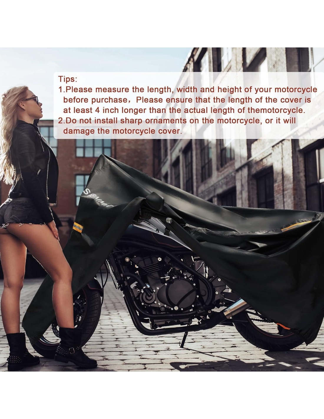 - Disponible en el tamaño correcto: Nuestras fundas para motocicletas son de ajuste universal y adecuadas para la mayoría de las motocicletas. Recomendamos que midas el tamaño de tu motocicleta (longitud, ancho y altura) antes de comprar y elijas el tamaño más apropiado para ella. Asegúrate de que la longitud de la funda sea al menos 10 cm más larga que la longitud real de la motocicleta. No instales adornos afilados en la motocicleta, o dañará la funda.