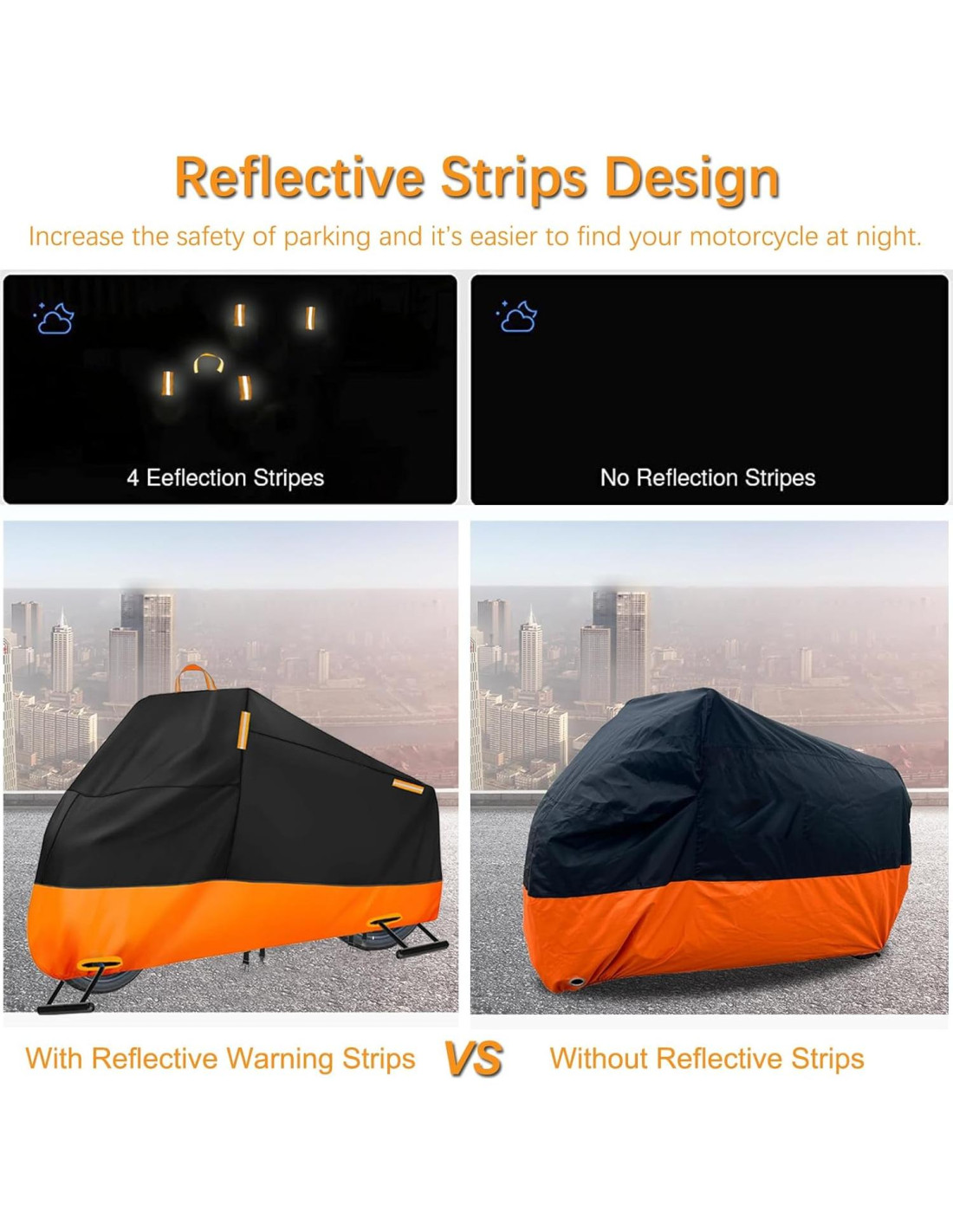 - 4 Tiras Reflectantes y Mango Reflectante Nuestra funda de lluvia para motocicleta está equipada con 4 tiras reflectantes en la parte delantera y trasera que facilitan encontrar tu motocicleta y ser llamativa en la oscuridad. El mango reflectante es conveniente para colgar y secar la funda.
