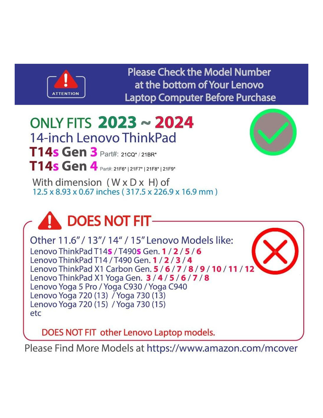 - Diseñado para ajustarse perfectamente a la serie 2023 ~ 2024 de 14 pulgadas Lenovo ThinkPad T14s Slim Gen 3 / Gen 4 con dimensiones (Ancho x Largo x Alto) de 12.51 x 8.93 x 0.70 pulgadas (317.7 x 226.9 x 17.9 mm).