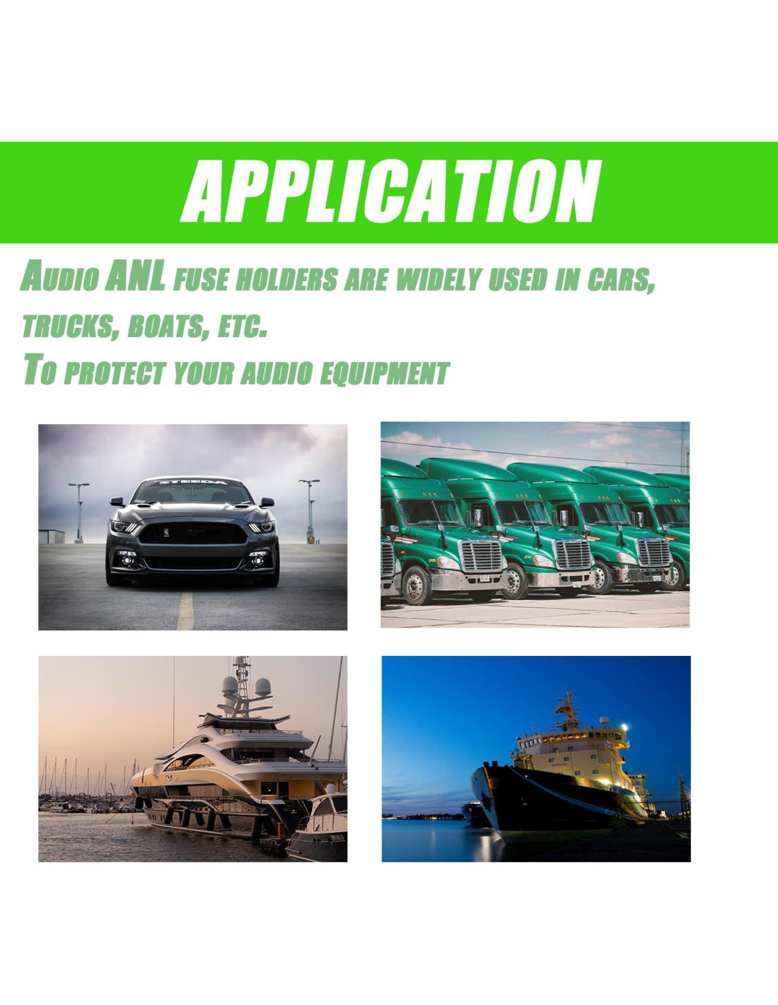 - Aplicaciones Los soportes de fusible ANL de audio se utilizan ampliamente en coches, camiones, barcos, etc. para proteger su equipo de audio