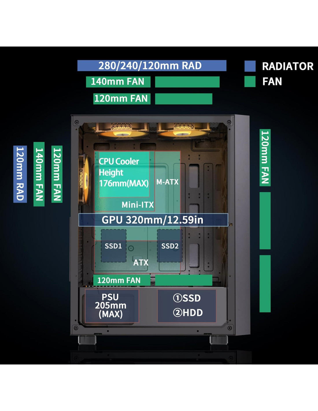 - Libertad para construir una computadora personalizada--No solo esta caja de PC gaming ofrece estética, sino que también sobresale en capacidad. Con amplio espacio para 4 unidades de almacenamiento, tendrás la libertad de almacenar todos tus juegos, aplicaciones y archivos multimedia sin compromisos. Puede soportar placa base ATX/Micro ATX/Mini ITX. Suficiente espacio para instalar fácilmente el AIO de 280mm en la parte superior sin tocar los módulos de memoria. Se pueden instalar hasta 8 ventiladores, sin necesidad de preocuparse por la disipación de calor.