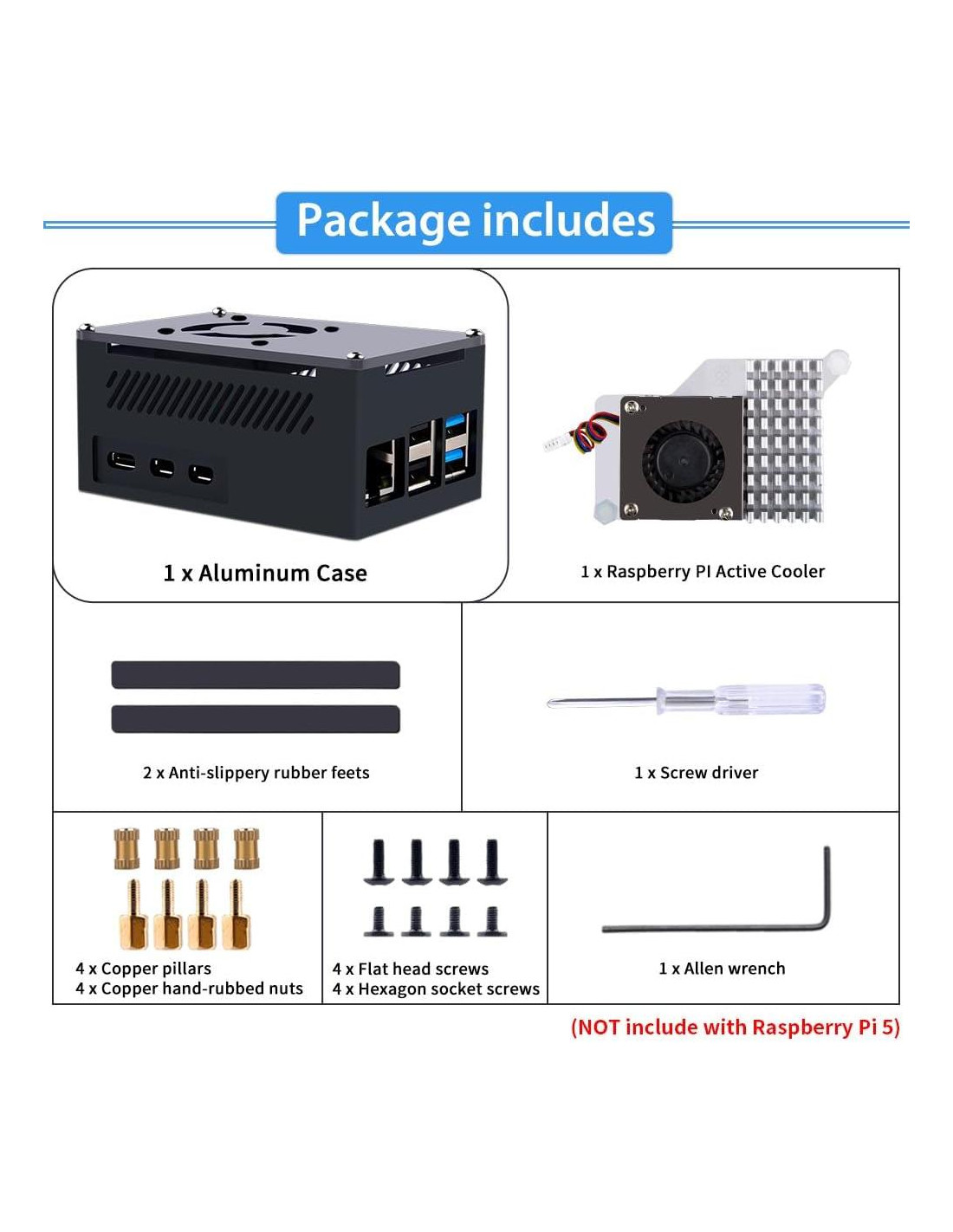 - El Paquete Incluye - 1x Caja de Aluminio para Raspberry Pi 5, 1x Enfriador Activo para Raspberry Pi 5, 1x Destornillador, 1x Paquete de Tornillos