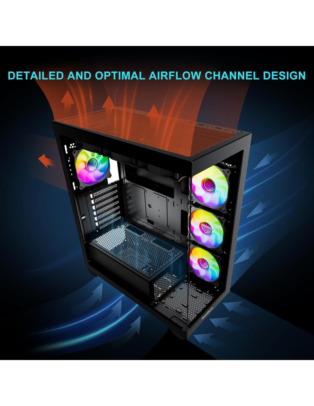 - Sistema de refrigeración: soporta hasta 10 ventiladores de 120mm y radiadores de 360mm, proporcionando refrigeración eficiente para componentes de alto rendimiento