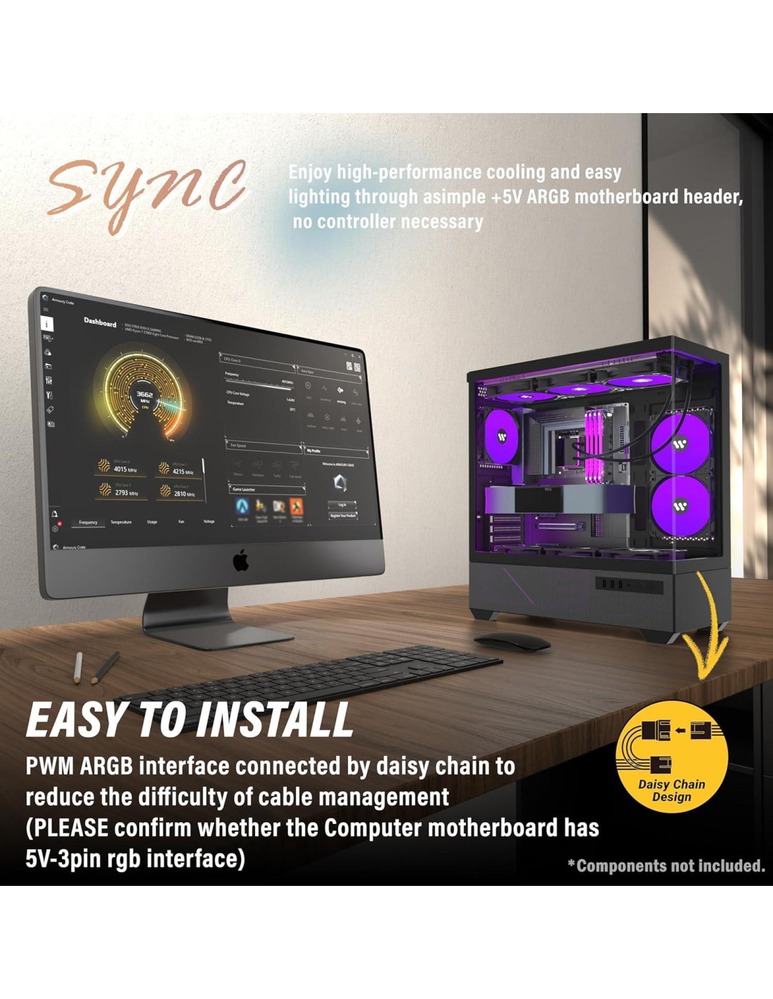 - [Enrutamiento de Cables Superior] Los 5 Ventiladores ARGB de la Caja solo requieren 1 conexión de cable avanzada, reduciendo los procesos complejos de enrutamiento de cables. Gran espacio detrás de la bandeja de la placa base para la gestión oculta de cables. Disfruta de un enfriamiento de alto rendimiento y una iluminación fácil a través de un simple conector de placa base ARGB de +5V, sin necesidad de controlador.