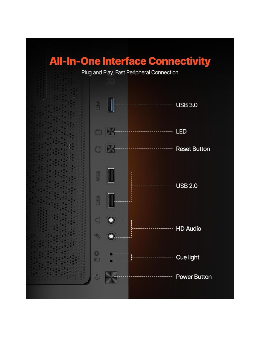 - Interfaz I/O Eficiente: El panel I/O diseñado cuidadosamente incluye un botón de encendido, 1 x USB 3.0 Tipo-A, 2 x USB 2.0 Tipo-A, jack de micrófono, jack de audio, botón de reinicio y botón de control de iluminación. Esta caja de computadora para juegos te brinda gran conveniencia.