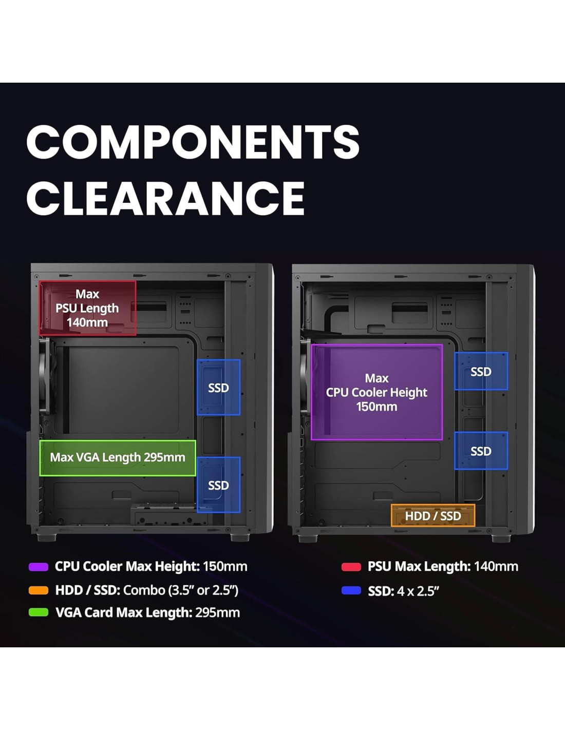 - Amplio Soporte de Hardware - Acepta GPUs de hasta 295mm de largo y enfriadores de CPU de hasta 150mm de alto.
