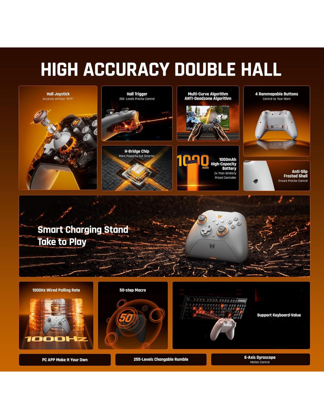 - Controladores de Juego Multifuncionales Gale Hall Controlador inalámbrico para PC para Switch, PC Windows10 y 11, Android, iOS están diseñados poderosamente con 4 botones traseros personalizados, joysticks Hall, gatillos Hall, control de movimiento de giroscopio de 6 ejes, tasa de sondeo por cable de 1000Hz, Turbo, Macro, vibración ajustable de 255 niveles, chip H-Bridge, algoritmo anti-zona muerta, mapeo de teclado, captura de pantalla, batería de 1000mAh, soporte de carga inteligente, aplicación para PC. Los controladores de juego Gale Hall de BIGBIG WON son compatibles con el juego Black Myth: Wukong.