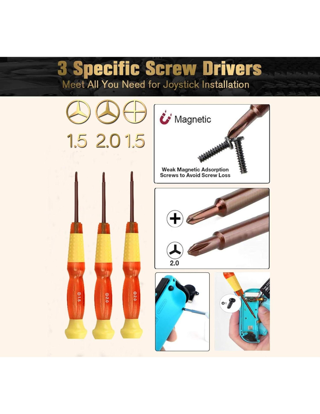 - [Destornillador de Alta Calidad]-- El mango de material dual ofrece un agarre más cómodo y un rendimiento superior. La punta del destornillador de reemplazo de joystick joycon está hecha de acero inoxidable de alta calidad con alta resistencia y tenacidad, por lo que puedes reparar fácilmente la consola de juegos sin dañar la consola de juegos. El destornillador con puntas magnéticas hará que sea muy fácil levantar el tornillo después de que haya terminado de desenroscar