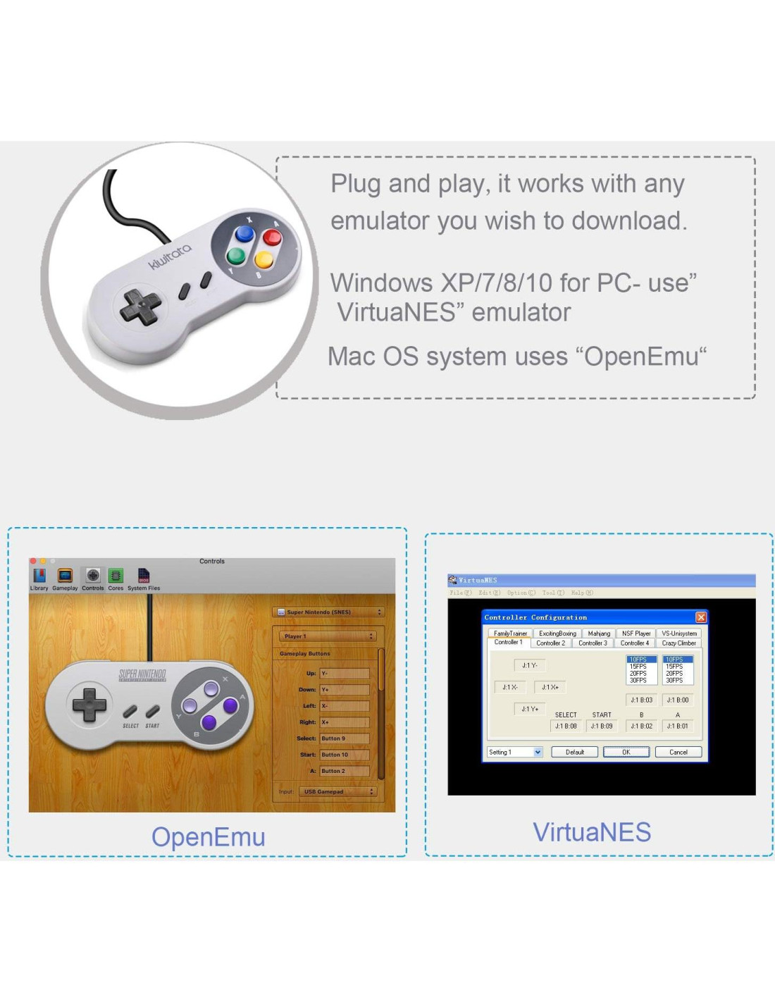 - [Conexión USB] Puerto USB 2.0 estándar con un cable de 1.5 metros (5 pies), no necesita instalar ningún controlador, debes configurar manualmente los botones y direccionales dentro del emulador que estés usando, y el controlador no asigna automáticamente botones/ejes direccionales. Aviso: por favor descarga primero el emulador de juegos antes de comenzar los juegos, puedes descargar el emulador "VirtuaNES" en PC y "OpenEmu" en MAC.