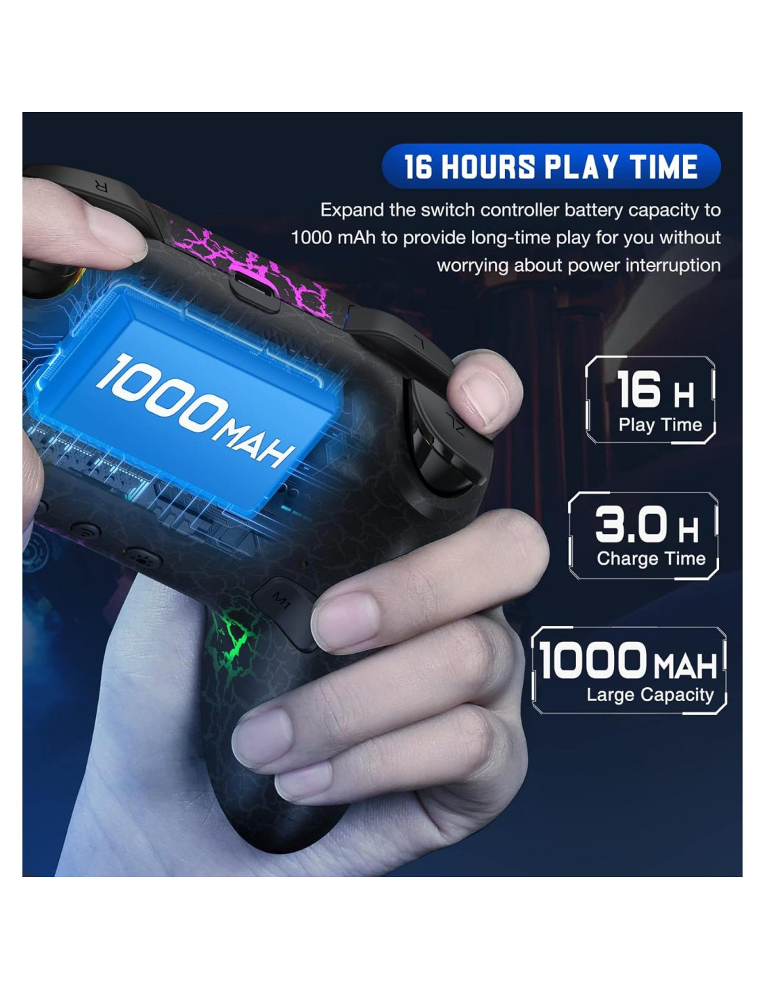 - [Capacidad de Batería de 1000mah] Para satisfacer las necesidades de tiempo de juego de los jugadores, aumentamos la capacidad de la batería del controlador a 1000mah, que es el doble de la capacidad de otros controladores. El paquete incluye un cable de carga UBS-C, y una carga de 3 horas puede durar aproximadamente 12-16 horas, incluso con el efecto de luz encendido también puede asegurar una mayor duración del juego (el tiempo de juego utilizado sin el efecto de luz será más largo).