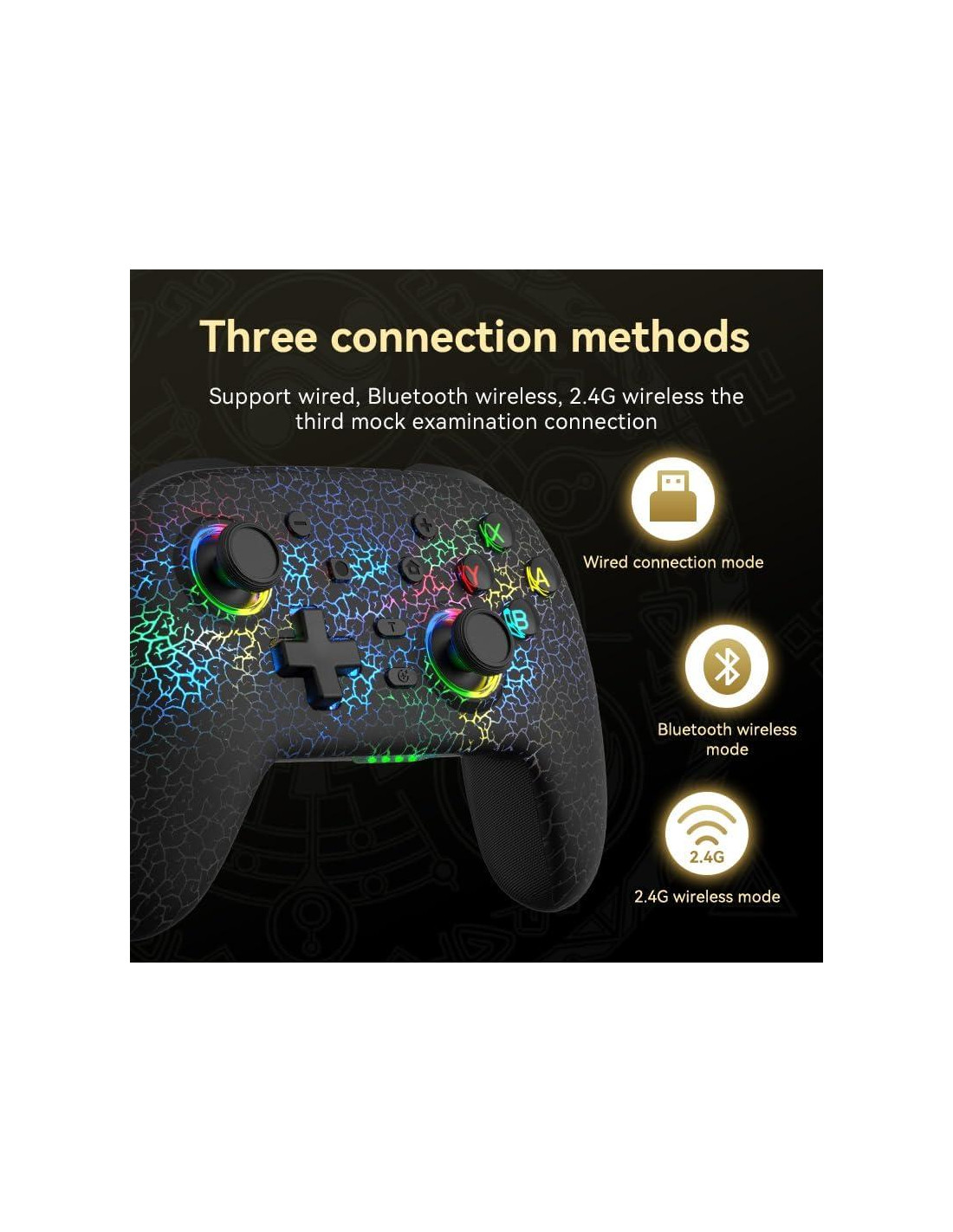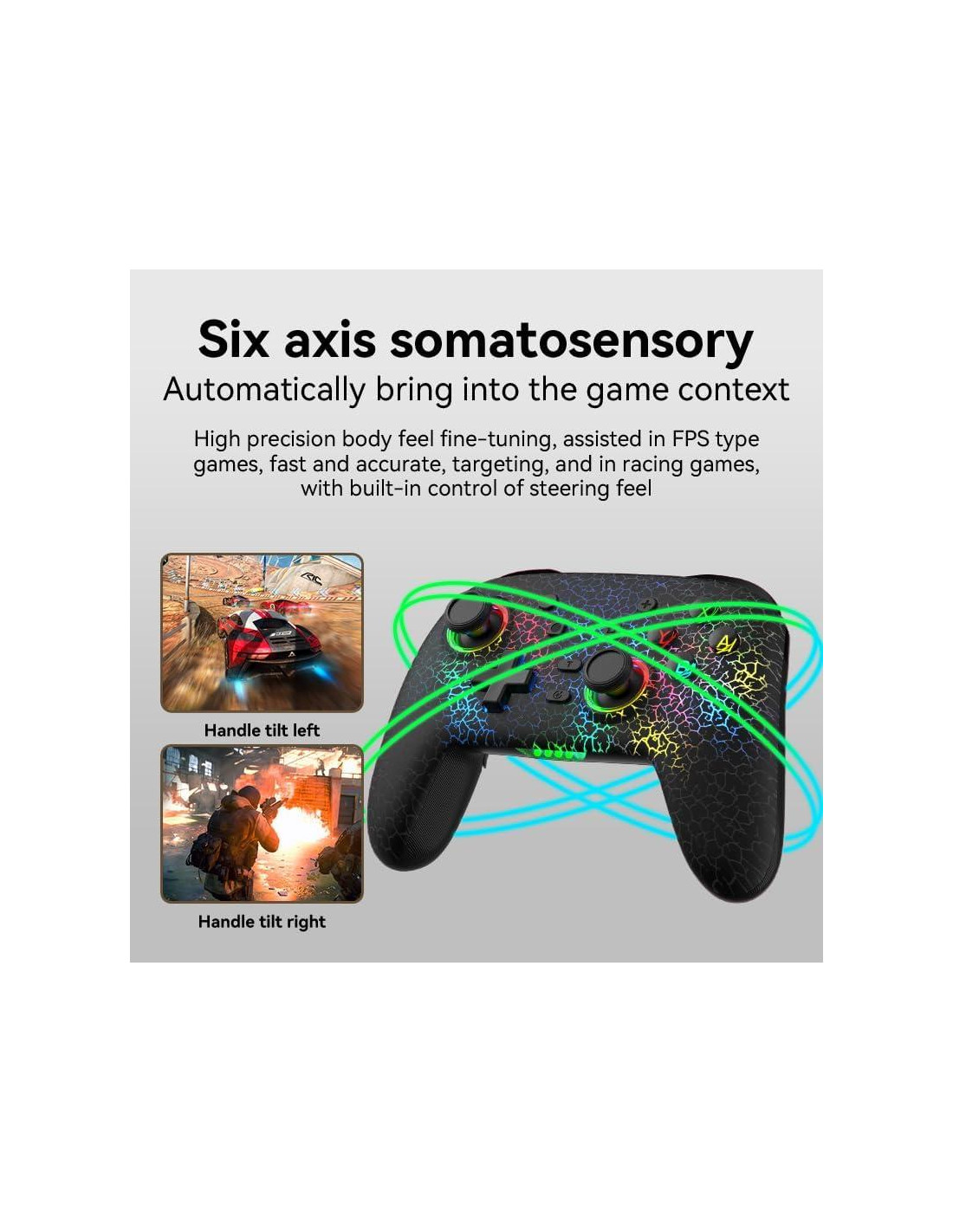 - Retroalimentación Sensorial Inmersiva Nuestro controlador está fabricado con materiales de alta calidad, proporcionando un agarre cómodo y una durabilidad mejorada. El joystick y los botones de 360 son ultra-sensibles y suaves, asegurando un control preciso y un juego sin esfuerzo. Los motores de vibración dual incorporados ofrecen diferentes efectos de vibración según la escena del juego, el sensor giroscópico de 6 ejes detecta la inclinación del controlador sumergiéndote en una experiencia de juego verdaderamente inmersiva.