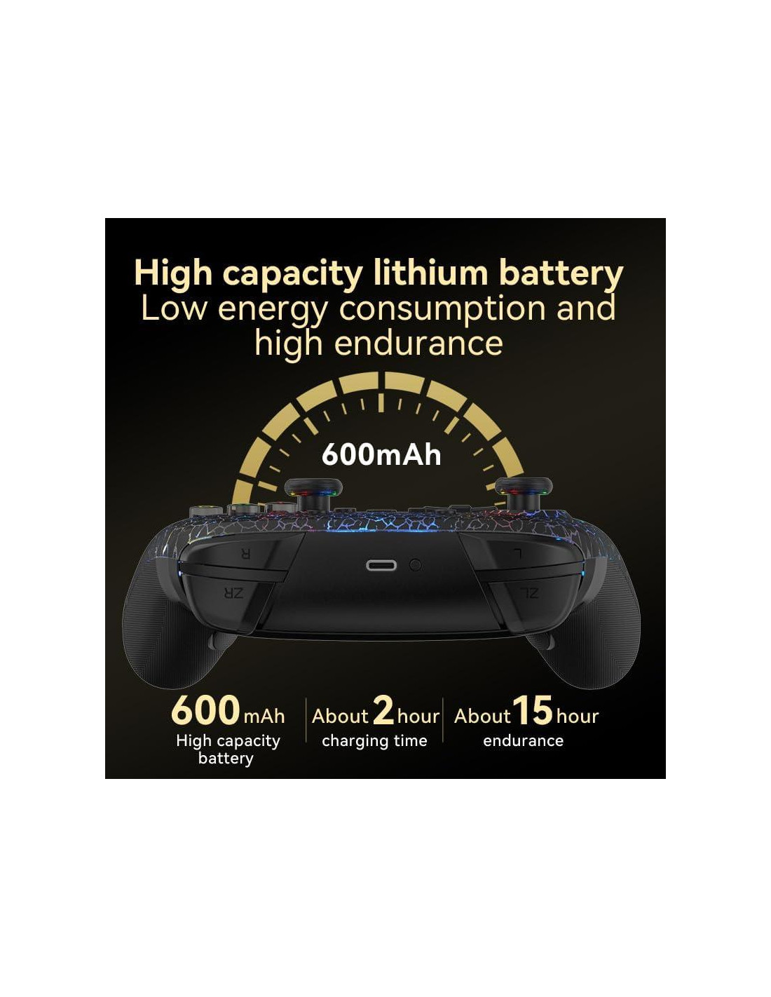 - Sesiones de Juego Prolongadas Nunca te preocupes por quedarte sin batería durante intensas sesiones de juego. El Controlador Pro Inalámbrico RALAN para Switch está equipado con una batería de 600mAh, permitiendo hasta 8 horas de juego continuo. Incluso durante la carga, aún puedes usar el controlador sin interrupciones. Una carga completa toma solo 2-3 horas, lo que lo hace ideal tanto para largas sesiones de juego como para necesidades de carga rápida.