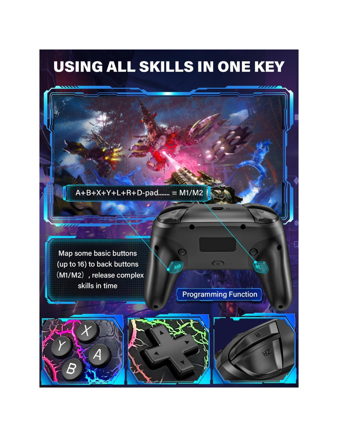 - Botón Programable & Función Turbo: El Controlador Pro Switch puede ser programable, asignar algunos botones básicos (A/B/X/Y/L/ZL/R/ZR.... hasta 16) a los botones traseros (M1/M2). Dos métodos de mapeo: Mapeo simple y múltiple. Presiona y mantén el botón SL/SR durante 3 segundos para activar el modo de salida cíclica ML o MR (intervalo de 5 segundos). También soporta Turbo automático y manual, 3 velocidades ajustables: 5 disparos/s, 12 disparos/s y 25 disparos/s. Te ayudará a liberar todas las habilidades complejas a tiempo, evitando la fatiga de los dedos