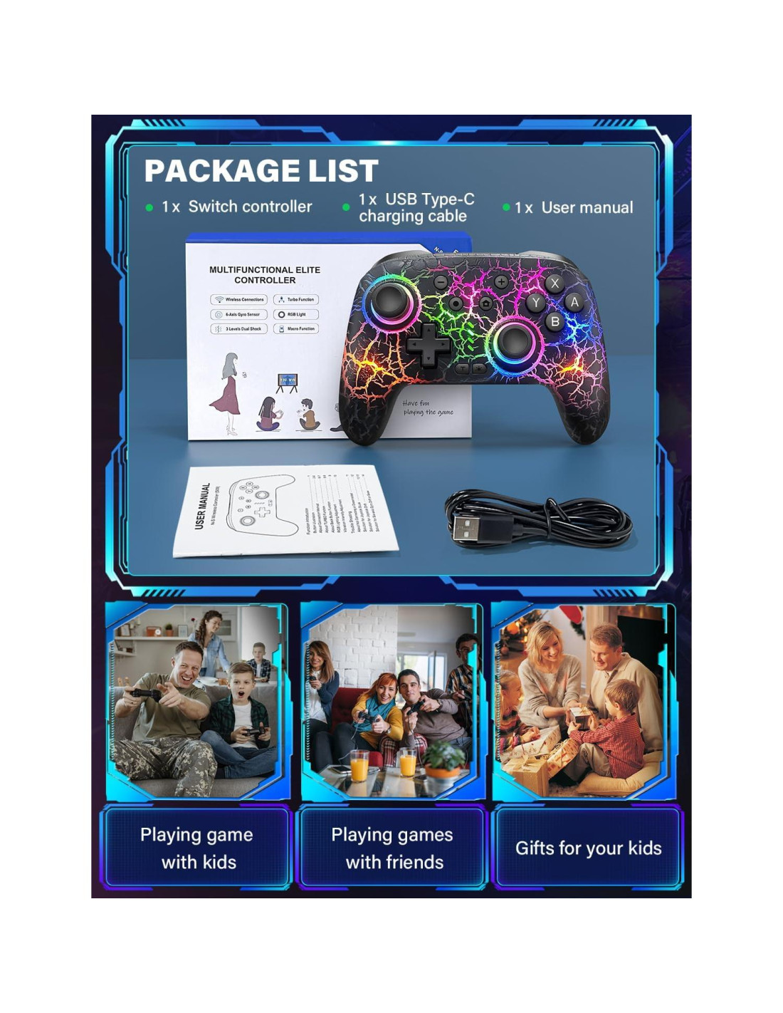 - Luz RGB Genial & 9 Colores & 5 Modos: El controlador Switch para Nintendo tiene un genial estilo de luz RGB de relámpago agrietado, 9 colores brillantes, añadiendo un sentido de tecnología futurista y proporcionando juego en entornos oscuros. 5 modos de luz: modo de respiración arcoíris, modo de respiración de un solo color, modo estático, modo parpadeante y modo LED apagado. Puedes elegir diferentes modos de iluminación y brillo (40%-60%-80%-100%) para personalizar tu experiencia de juego y sumergirte profundamente en la experiencia de juego