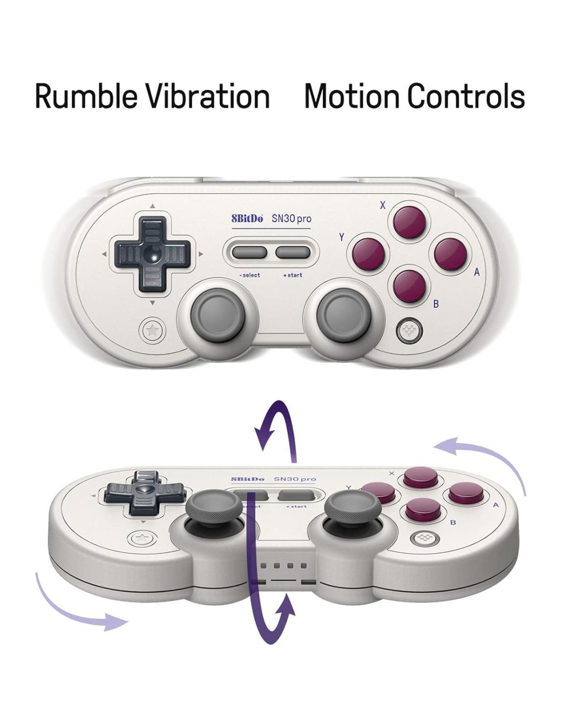 - El SN30 Pro es el primer controlador retro totalmente funcional del mundo. Cuenta con un conjunto completo de botones con joysticks clicables, vibración, controles de movimiento, bluetooth inalámbrico, batería recargable, botones de inicio y captura de pantalla, y un conector USB-C. Sin mencionar un d-pad adecuado.