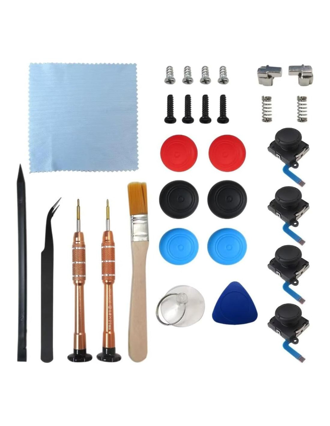 - El Paquete Incluye: 4x Joystic; 2x Pestillos de Aleación Joycon; 4x Tornillos Y1.5 (para tornillo de carcasa Joy-Con); 4x Tornillos +1.5; 6x Caps de Thumbstick; 1x Destornillador Y1.5 (S2); 1x Destornillador +1.5 (S2); 1x Palanca de Plástico; 2x Resortes; 1x Paño de Limpieza; 1x Plectro Triangular; 1x Ventosa; 1x Pinzas; 1x Cepillo de Limpieza.
