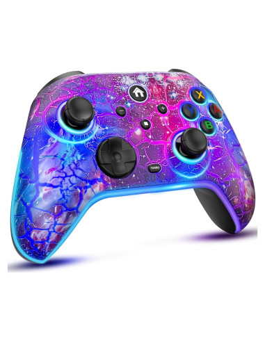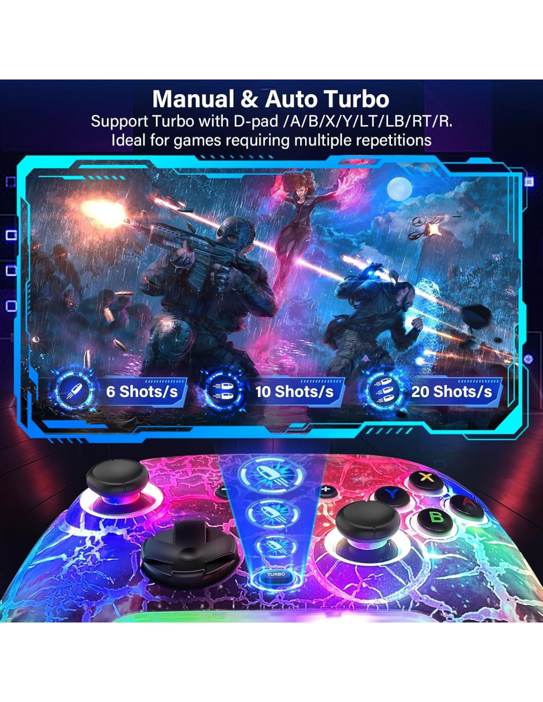 - [Controladores de Switch con 10 Modos de Luz RGB] Si estás buscando un controlador de switch iluminado, hazlo genial. El agarre del controlador inalámbrico de switch diseñado con un patrón de nebulosa cósmica es simplemente un bono de arte en la oscuridad. Tiene hasta 10 fascinantes modos LED, que son modo de respiración de un solo color de 8 colores, modo intermitente y modo de respiraciones de un solo color en turnos. Simplemente cambia de modo presionando por separado la tecla 'set' para tu atmósfera de juego o simplemente mantén presionado para apagar.