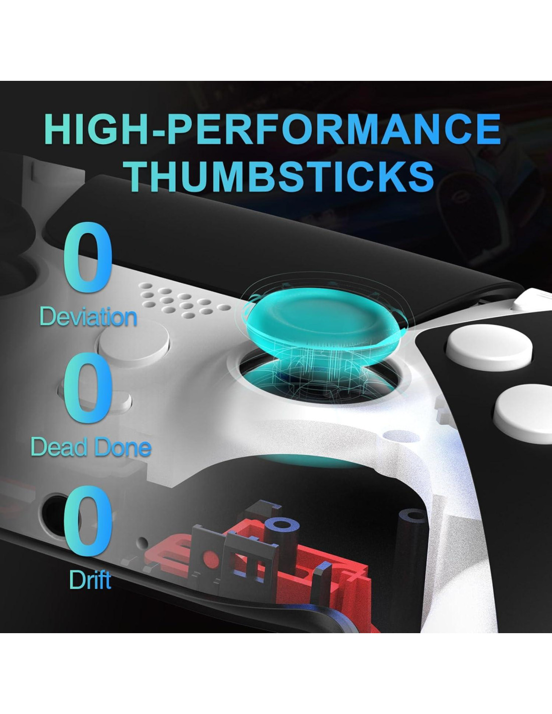 - [Supera al Original, Cero Deriva, Respuesta Instantánea] A diferencia de la mayoría de los controladores ps4, Ymir utiliza joysticks ALPS de alta precisión para un control más suave, sin deriva y una respuesta más rápida. Más responsivo y preciso que los sensores Hall, ofreciendo cero zonas muertas, sin retraso y sin deriva. Inspirado en el aspecto del controlador de playstation 5, es compatible con juegos de controlador ps4 en PS5. Mantén presionado L1 + R1 + Joystick Izquierdo + Círculo durante 3 segundos para auto-calibrar la deriva.