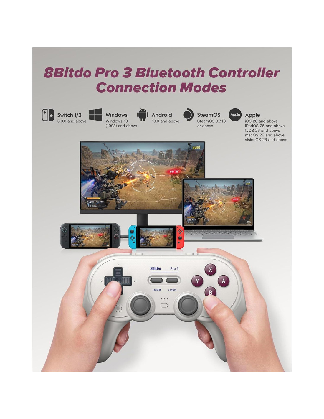 - Compatibilidad Multiplataforma - Compatible con Switch 1 y 2, PC con Windows, macOS, SteamOS y dispositivos Android. Nuestro controlador pro 3 de 8bitdo para tus mundos de juego.