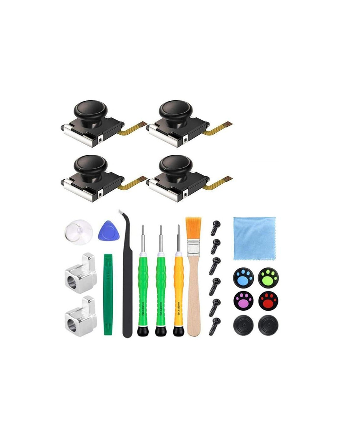 - Kit Completo: Este conjunto de 18 piezas incluye 2 reemplazos de joystick, 4 empuñaduras, 4 tornillos y 8 herramientas esenciales para reparaciones de joycon sin problemas.