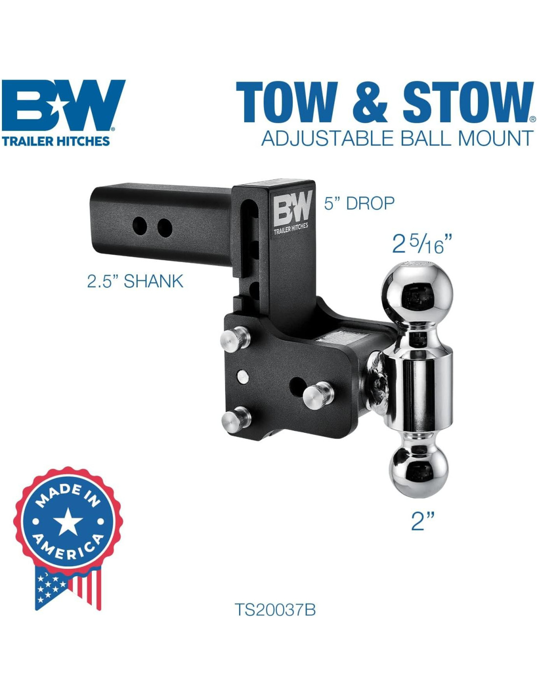 - HECHO EN ESTADOS UNIDOS - El Soporte de Bola de Remolque Ajustable Tow & Stow se fabrica y ensambla completamente en Humboldt, Kansas, donde podemos supervisar cada detalle. Los empleados-propietarios de B&W respaldan cada producto que fabricamos y están orgullosos de los valores del Medio Oeste que han moldeado nuestra empresa en lo que es hoy. Solo fabricamos los mejores enganches y accesorios de remolque para que usted pueda concentrarse en el camino por delante y nunca preocuparse por lo que hay detrás.