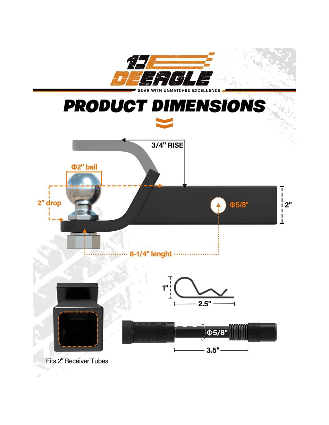 - Uso generalizado: Esta bola de enganche para remolque cuenta con un vástago de 2 pulgadas x 2 pulgadas, lo que la hace compatible con la mayoría de los receptores estándar de 2 pulgadas de la industria. Además, ofrece una caída de 2 pulgadas (5.08 cm) y un aumento de 0.75 pulgadas (1.9 cm), asegurando un remolque nivelado al conectar su vehículo y remolque.