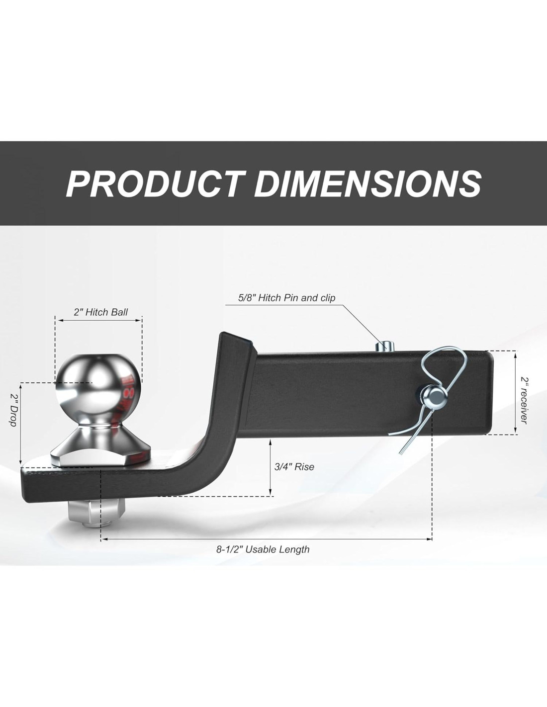 - Características del Producto: El montaje de bola de enganche tiene un enganche de caída de 2 pulgadas y un enganche de elevación de 3/4 pulgadas para facilitar su remolque. Está diseñado con un peso bruto máximo de remolque de 7500 lbs (3,402.3 kg) y un peso de lengua de 750 lbs (340.2 kg), enganche de alta resistencia.