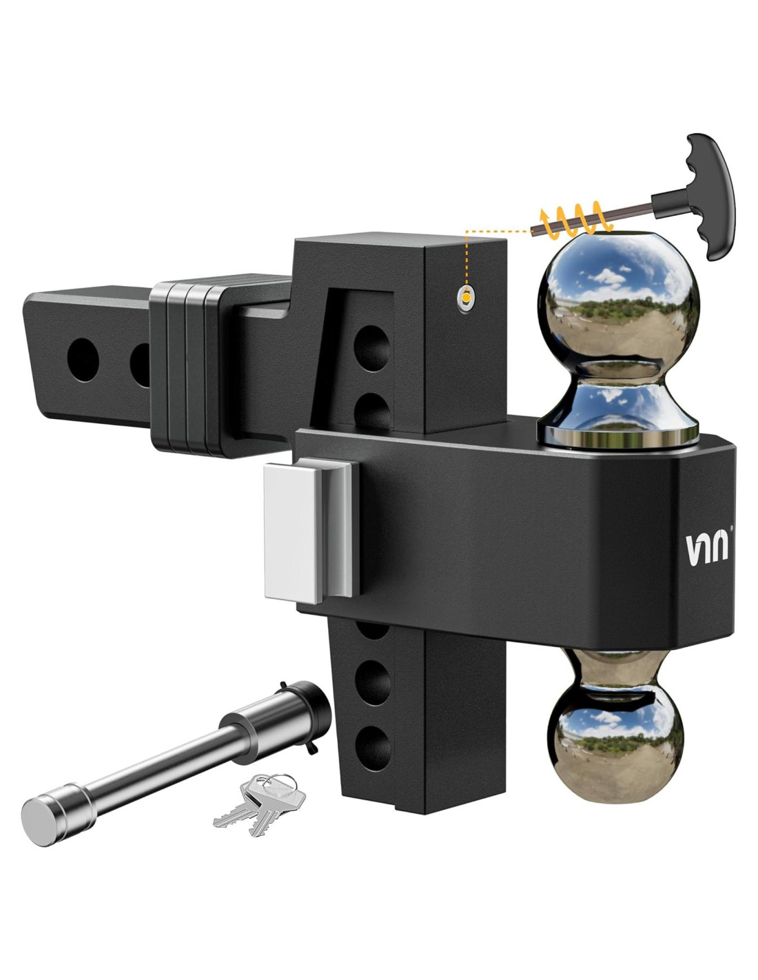 No busques más allá del enganche de remolque ajustable de doble bola VNN, la solución de remolque versátil y duradera en el mercado. Con su innovador diseño anti-vibración, este enganche elimina ruidos y vibraciones molestos, brindándote una experiencia de remolque suave y cómoda. Y con su característica anti-robo, puedes estar seguro de que tu enganche permanecerá seguro mientras está estacionado. Patente de EE. UU. 10857846, bajo licencia de Uriah Products, LLC
