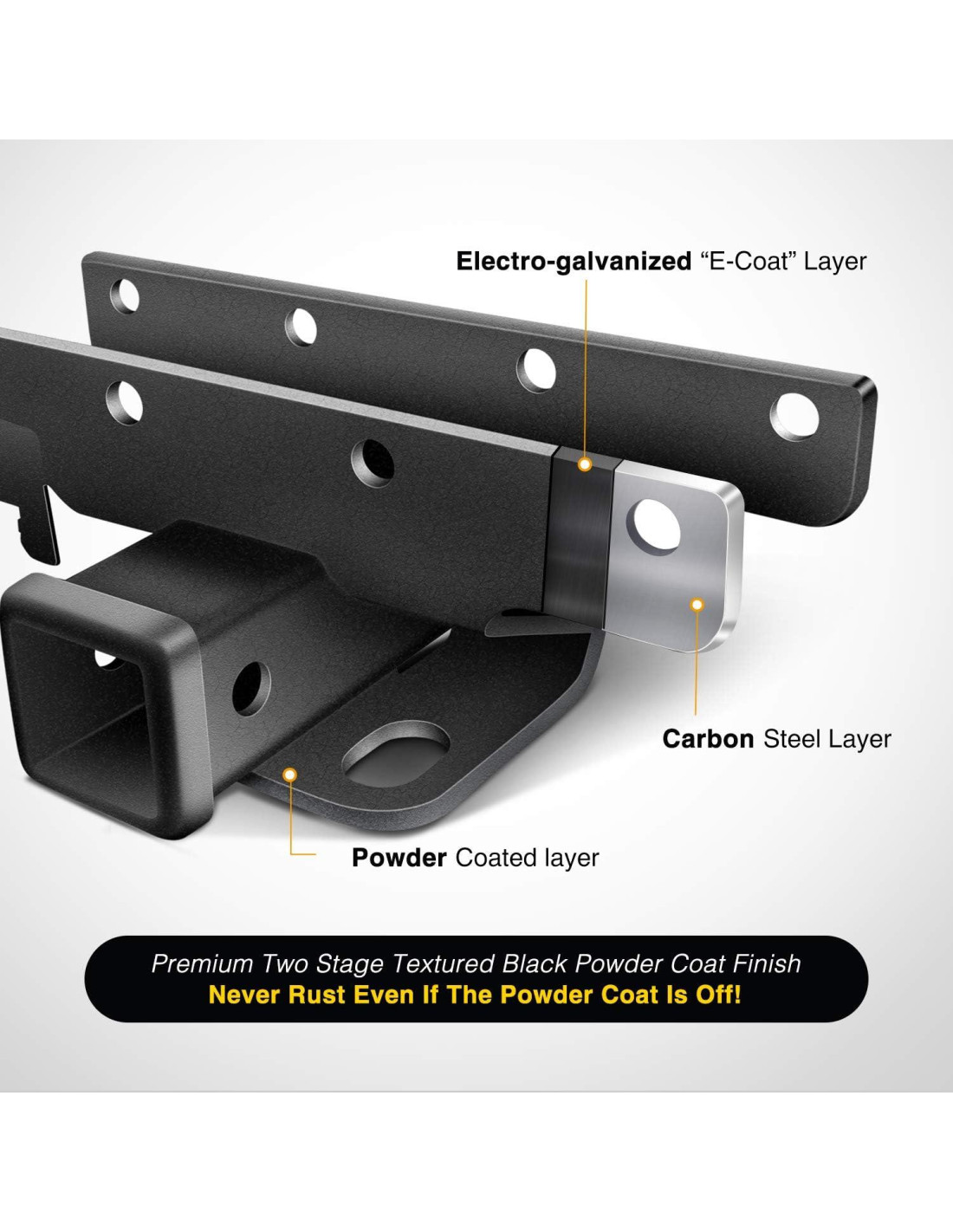 - ENGANCHE RECEPTOR TRASERO DE 2" - Receptor cuadrado estándar de 2 pulgadas con una calificación de 3500 lb (1587 kg) de peso bruto del remolque y 350 lb (159 kg) de peso de lengua, hecho de tubos de grosor único y resistente.