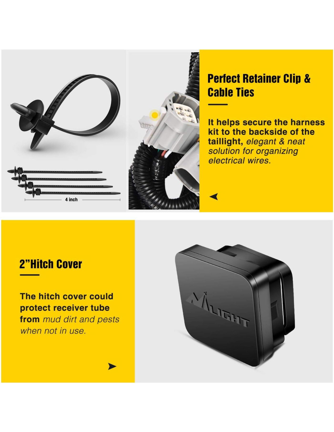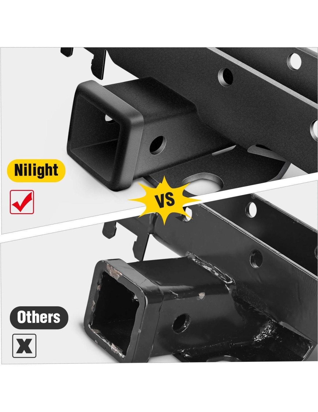 - FÁCIL INSTALACIÓN - No se requiere perforación. Instalación directa atornillada. Todos los herrajes de montaje y el arnés de cableado Plug & Play están incluidos. La cubierta del enganche puede proteger el tubo receptor de barro, suciedad y plagas cuando no está en uso. Garantía de 2 años otorgada por Nilight.