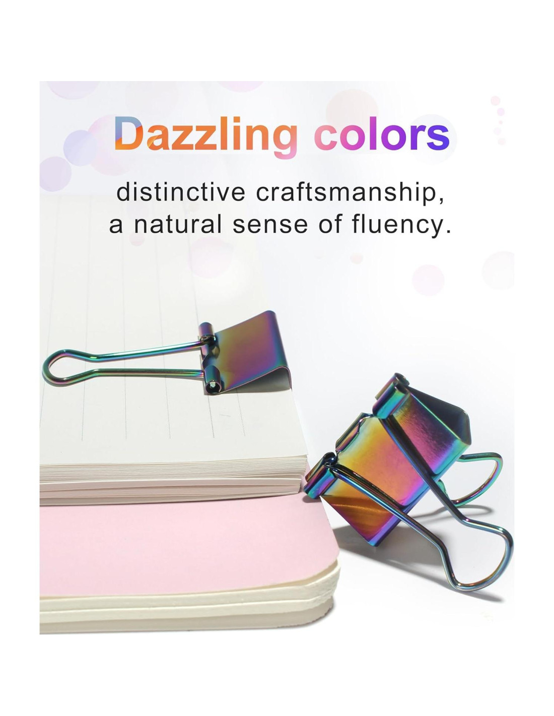 Descripción: Nuestros clips de carpeta están hechos de acero templado, fuertes para usar. Características: 1. Sin óxido en los papeles 2. 10 piezas, Superficie electrochapada con colores deslumbrantes 3. 1" (25.4mm) de ancho, 0.47 " (12mm) Capacidad 5. Fuertes clips de metal con Superficie electrochapada con colores deslumbrantes 6. Mantiene los archivos unidos, previene que los papeles se deslicen o se salgan. Garantía: Garantía de por vida para problemas relacionados con la calidad.