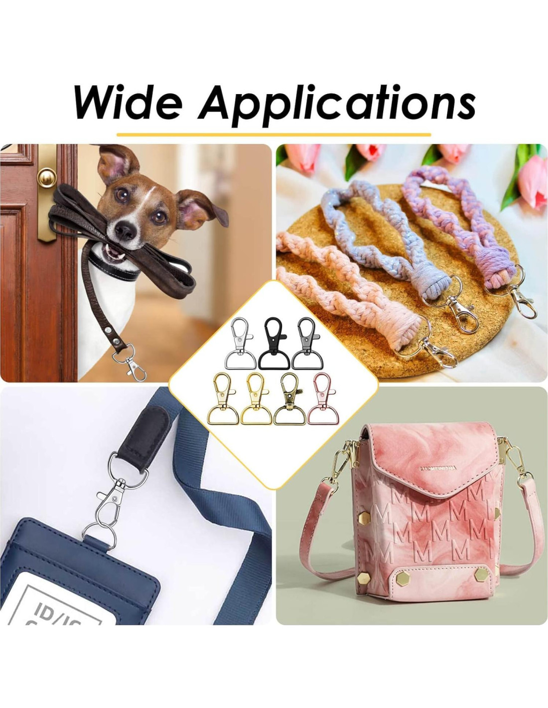 - USO MÚLTIPLE: El gancho de langosta giratorio con un ancho interior de 1.9 cm D anillo se puede adjuntar fácilmente a un colgante de llavero o correa de tejido para hacer llaveros, bolsos, collares para perros, lanyards, bolsos, proyectos de costura y manualidades DIY