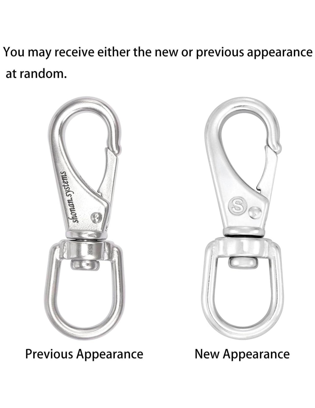 Shonan.Systems es una empresa activa en el campo de la industria de hardware desde hace 5 años. Los productos producidos incluyen mosquetones, enlaces rápidos, grúas y ganchos giratorios, de varias dimensiones y para una amplia gama de hogares e industrias. Estamos comprometidos con una excelente calidad y un gran servicio postventa para cada cliente. La apariencia de este gancho giratorio (SSBS-009) ha sido actualizada, un símbolo de 'S' de nuestra marca está marcado en el centro del cuerpo. Debido a razones de inventario, (ver la imagen). Por favor, tenga la seguridad de que ambos tienen nuestro servicio postventa. Cada pieza de hardware SHONAN viene con un servicio de reemplazo gratuito de un año en caso de cualquier falla. No apto para escalar. NO USE bajo ninguna circunstancia donde la desconexión pueda resultar en lesiones personales o daños a la propiedad. Estos ganchos giratorios son ideales para usar con anillos divididos, cuerdas, correas de perro, llaveros, cables y correas. Los ganchos de ojo giratorio están equipados con un resorte duradero. Permite una rápida sujeción a una cuerda, cable, cadena u otras líneas. La estructura de los ganchos giratorios SHONAN es razonable con rotación de 360 grados para un fácil clip. Genial para equipos deportivos y otras aplicaciones de accesorios. SSBS-016 SSBS-010 SSBS-018 SSBS-025 SNNP02 SNNP01 SNES02