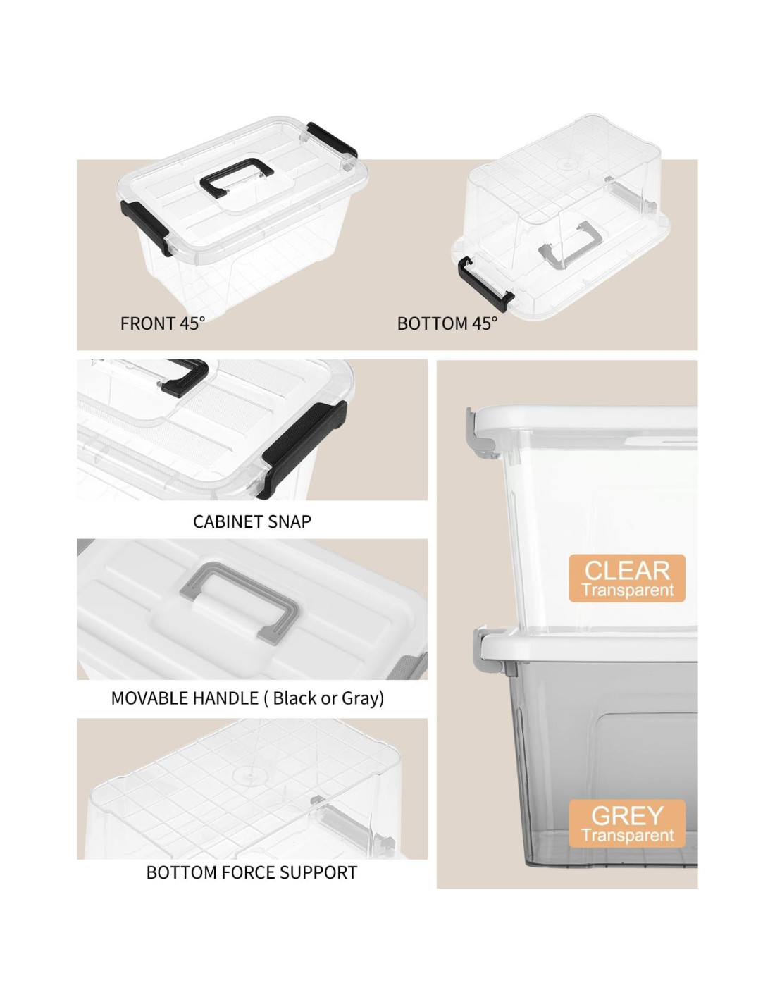 - Diseño Transparente: No más buscar tus cosas preciadas. El diseño transparente de estos contenedores de almacenamiento de plástico claro con tapas te permite encontrar cualquier artículo almacenado instantáneamente desde cualquier ángulo.